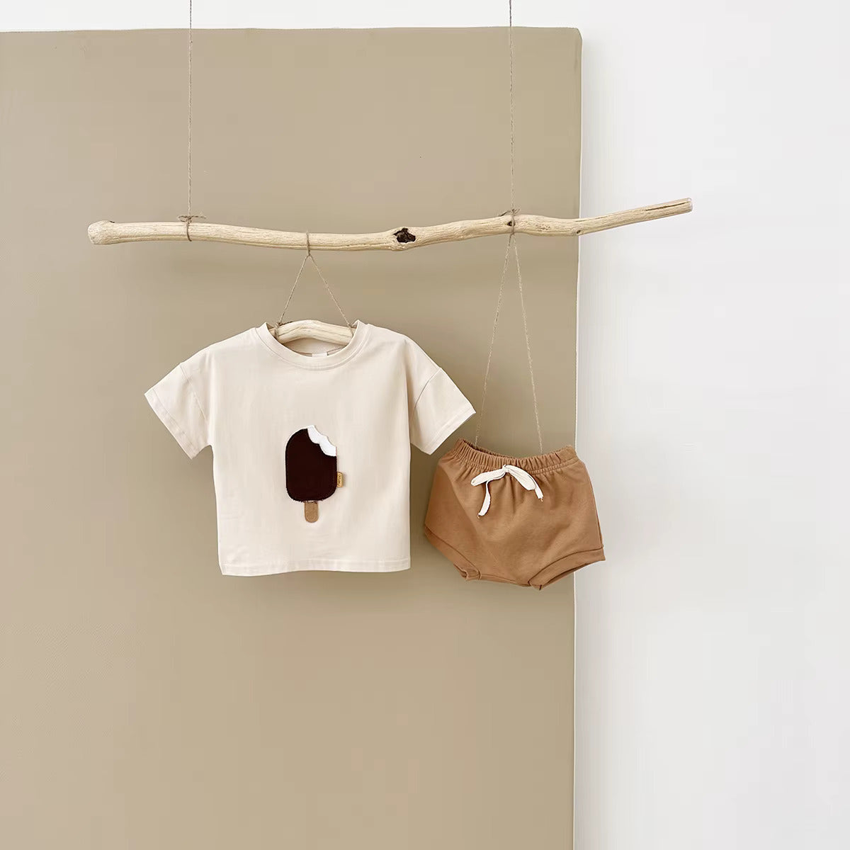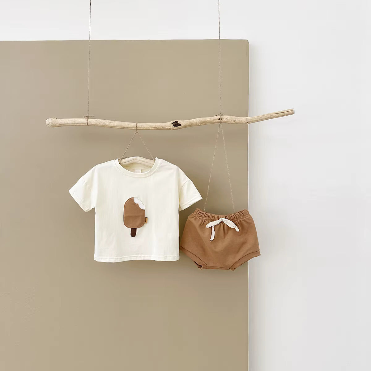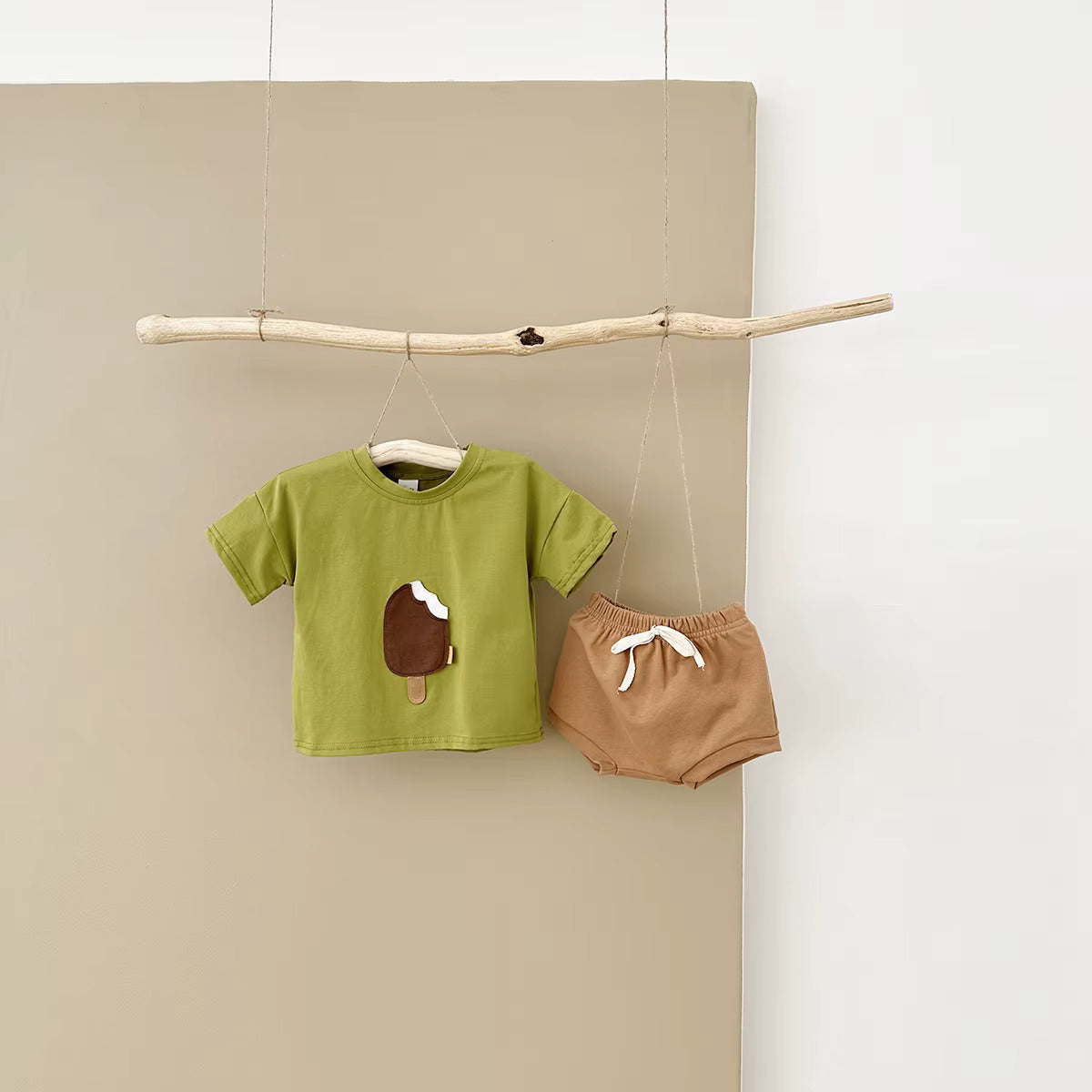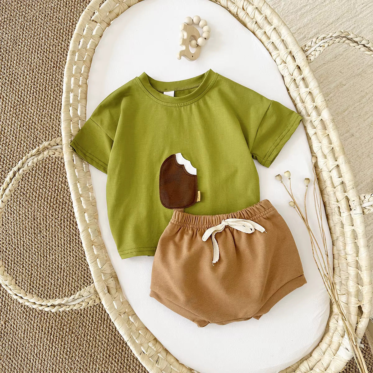 Dress your little one in this charming summer ensemble, featuring a delightful ice cream patch on a short-sleeve top paired with matching shorts. Crafted from 100% premium cotton, this outfit ensures maximum comfort and breathability during warm days.